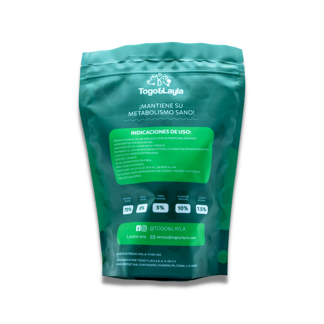 El pulmón de res es una excelente fuente de aminoácidos esenciales para la construcción y reparación de tejidos musculares en los perros. Nuestros premios son cocinados de manera natural.